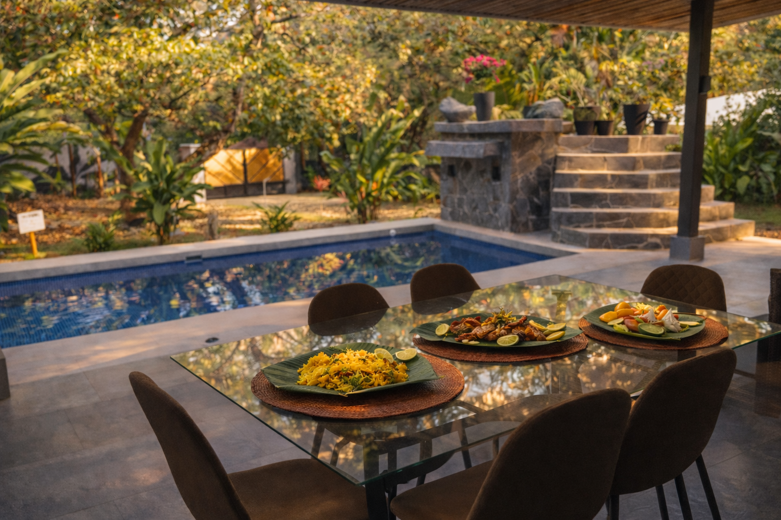 Dinner often flows into relaxed evenings by the pool or under the open sky, with the sounds of the jungle and the Pacific in the distance.